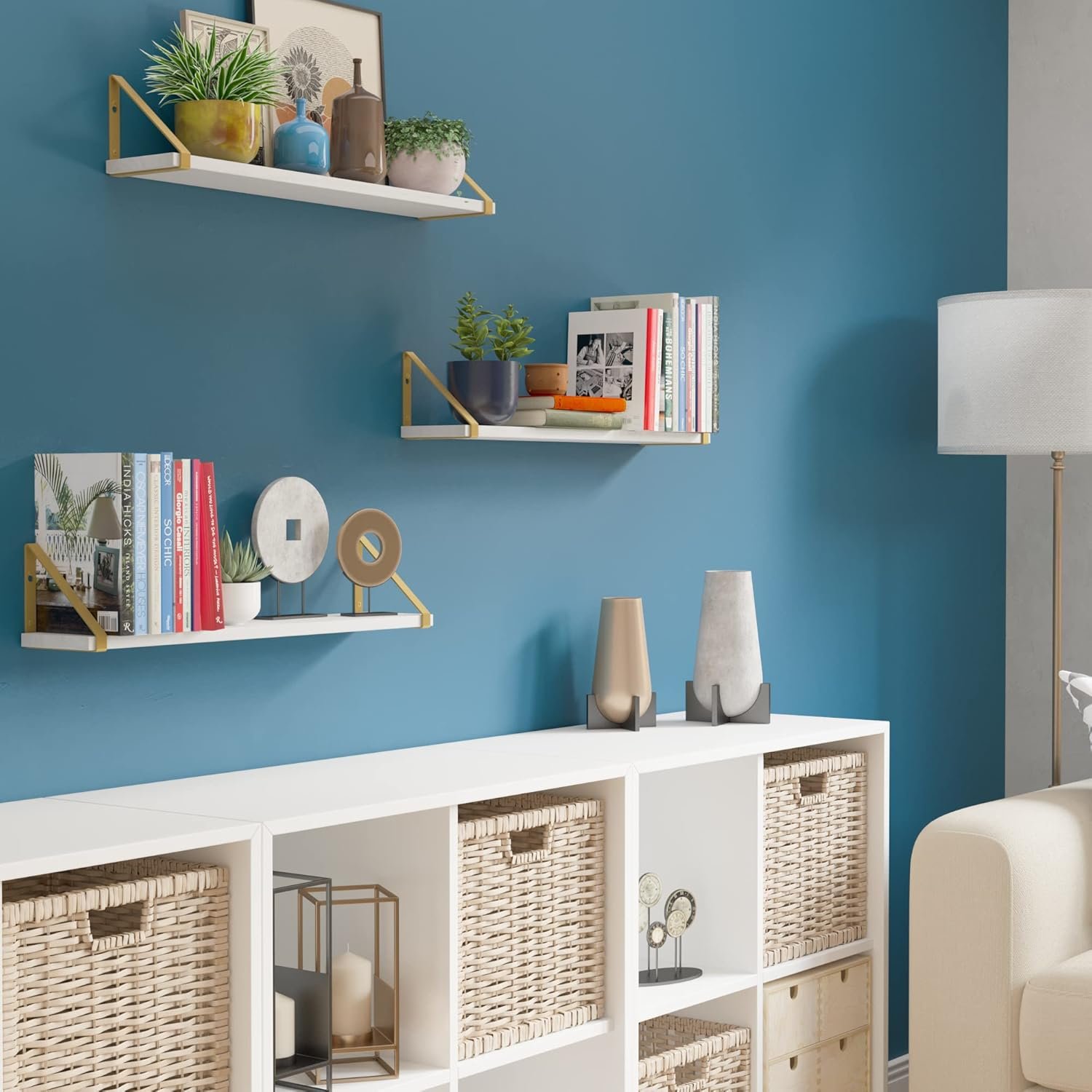 • Stylish Home Decor: Instead of bulky bookcases, use white shelves to neatly display and organize your favorite books, decorative frames, indoor plants and more. Keep everything within reach and create a sleek look with these white wall shelves with gold shelf brackets.